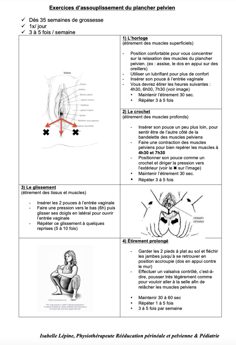 Bienvenue sur la page des exercices d'étirement du plancher pelvien du GMF La Cigogne. Dans cette section, nous vous expliquerons en détail les exercices recommandés pour diminuer les risques de déchirure à l'accouchement.